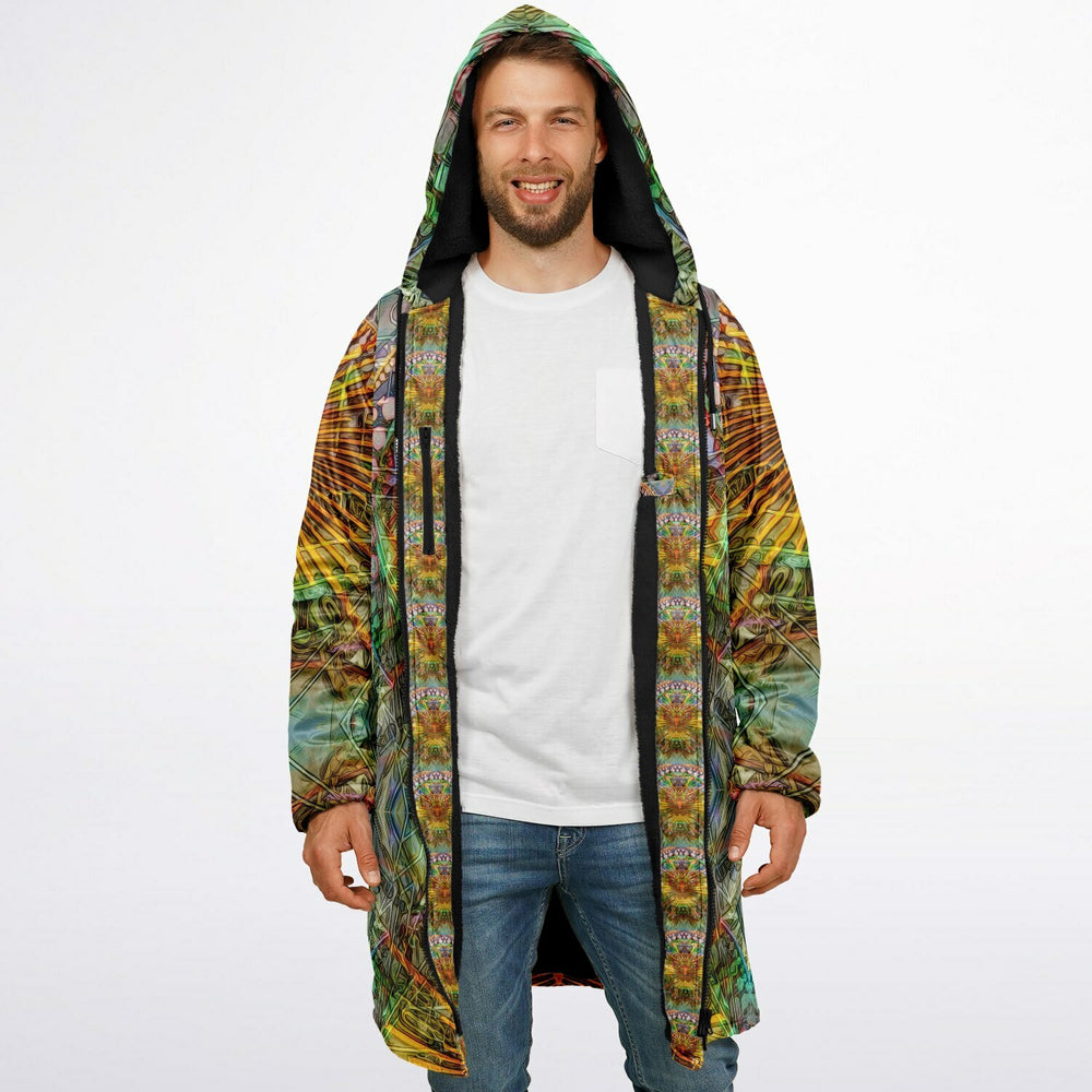 Lotus Guardian Cuddle Coat | Unisex Minky Sherpa Lined Coat with Hood, Zipper and Pockets | Women and Mens Festival Coat | Mountain Fashion
