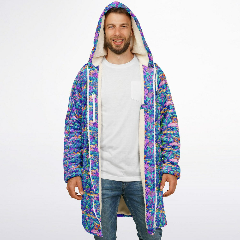 Psychedelic Mushrooms Cuddle Coat | Unisex Minky Sherpa Lined Coat with Hood, Zipper and Pockets | Women and Mens Festival Coat | Mountain Fashion
