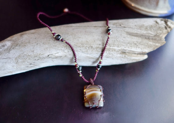 Short Agate Macrame Necklace | Stone for Protection | Unisex Healing Crystal | Chalcedony