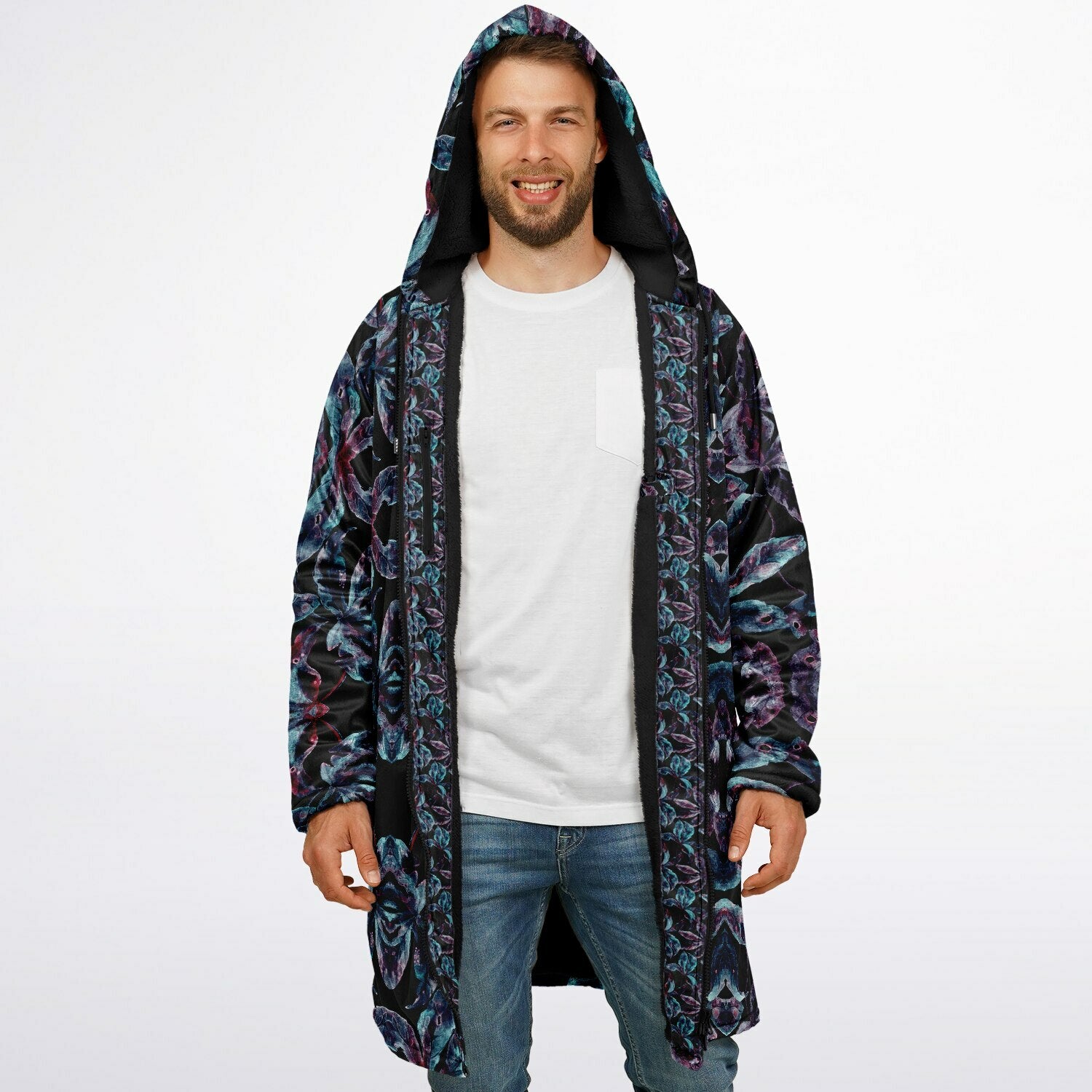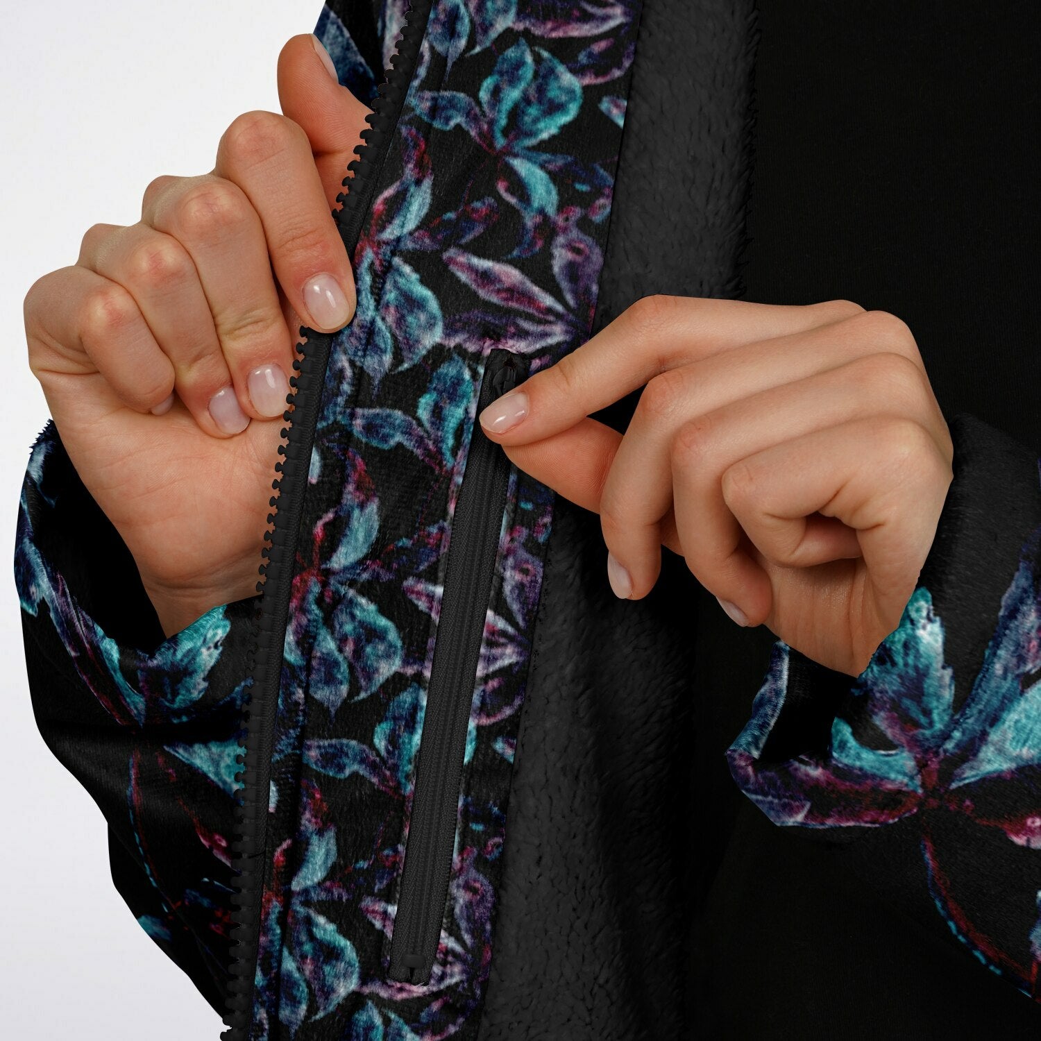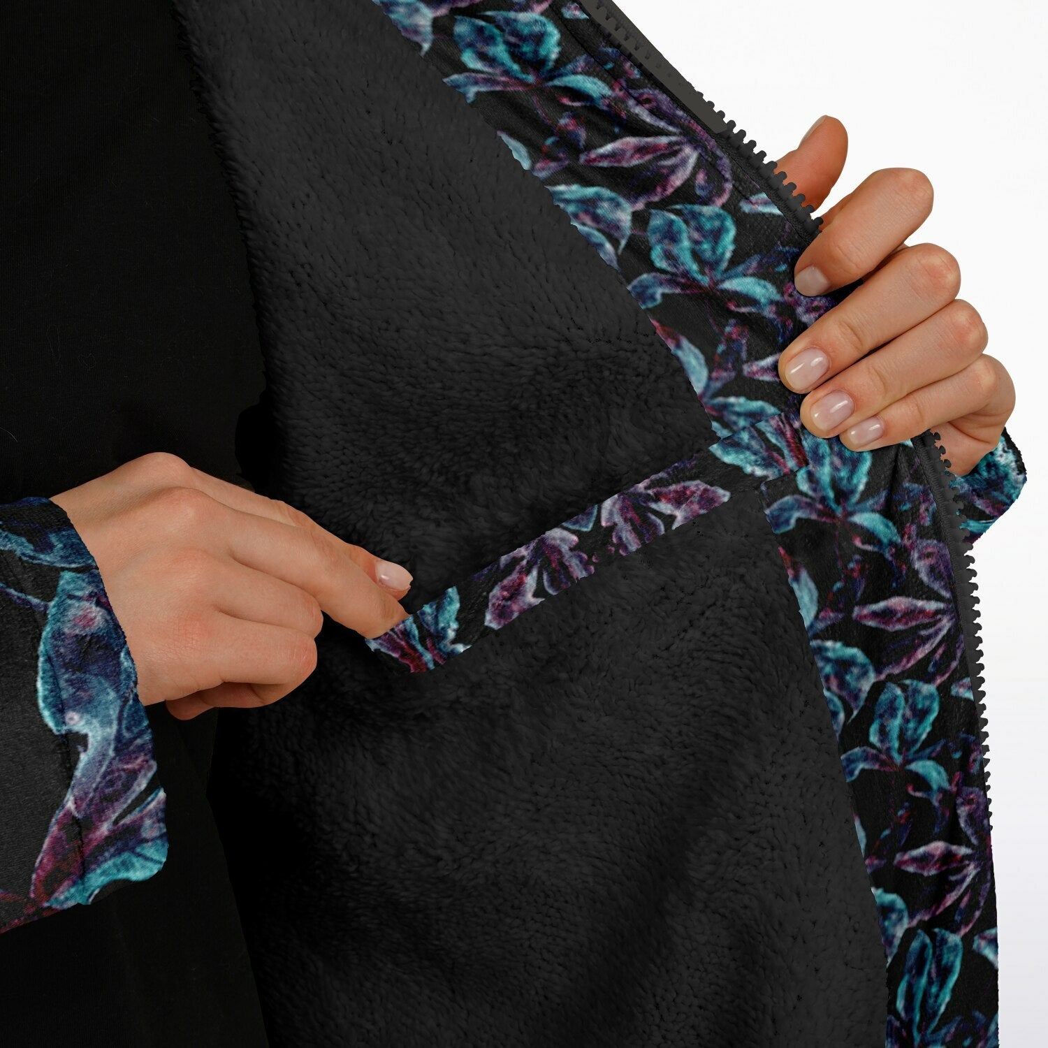 Dark Tropics Cuddle Coat | Unisex Minky Sherpa Lined Coat with Hood, Zipper and Pockets | Women and Mens Festival Coat | Mountain Fashion