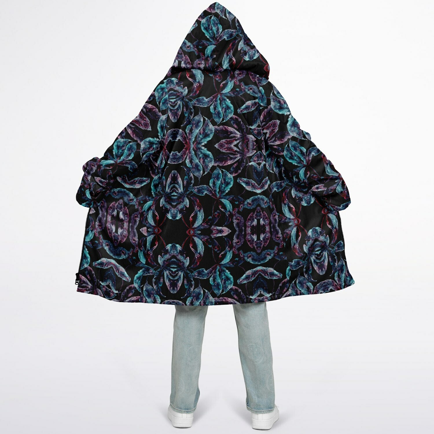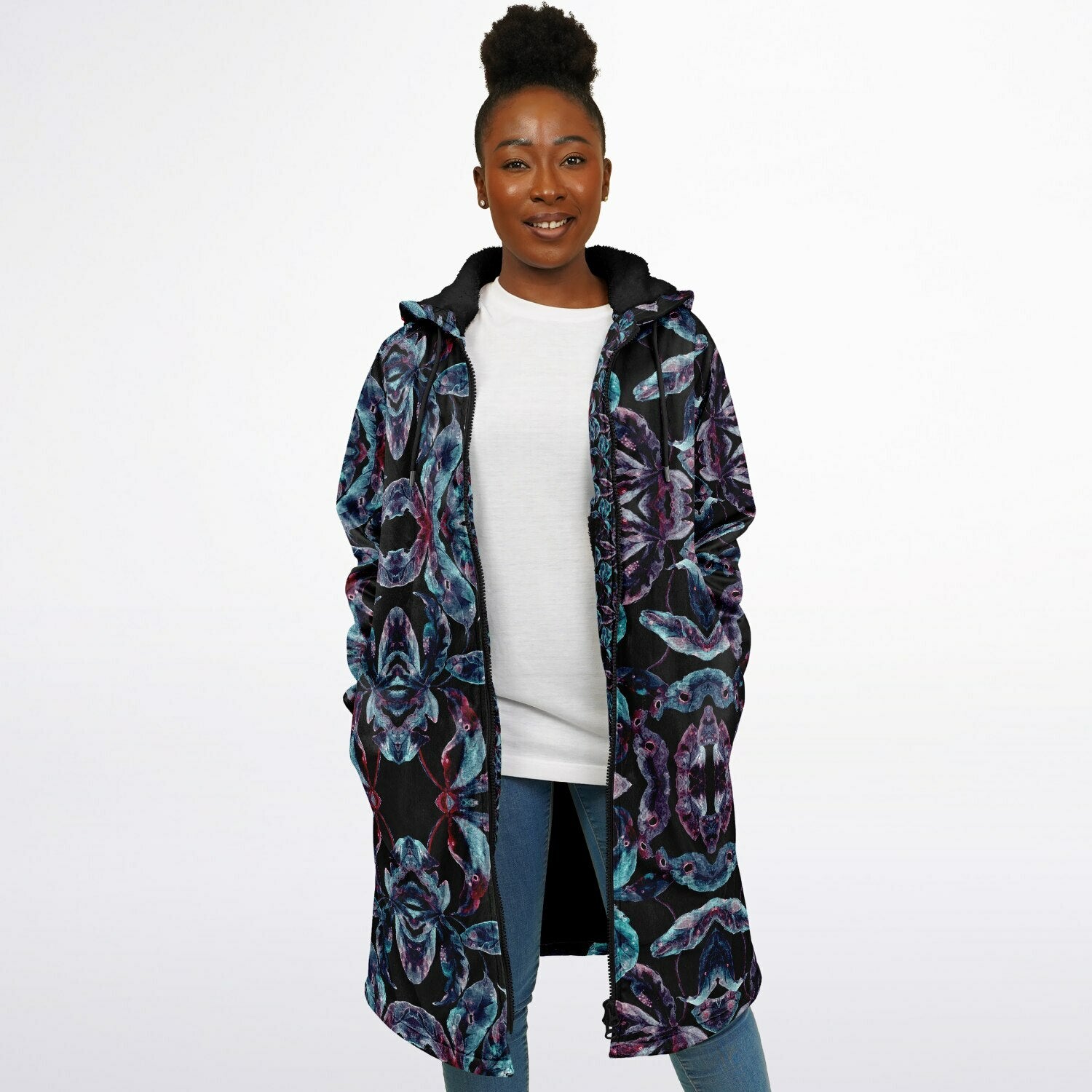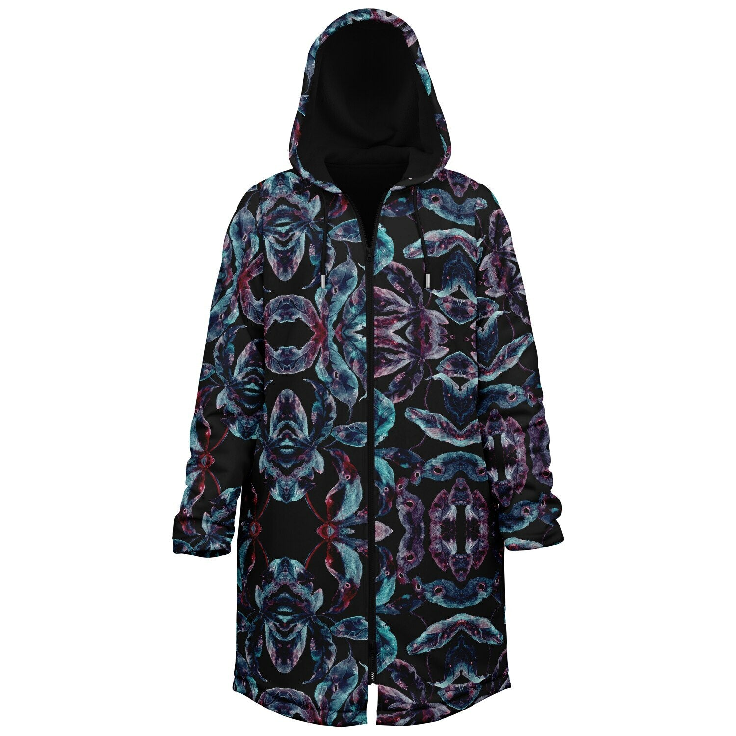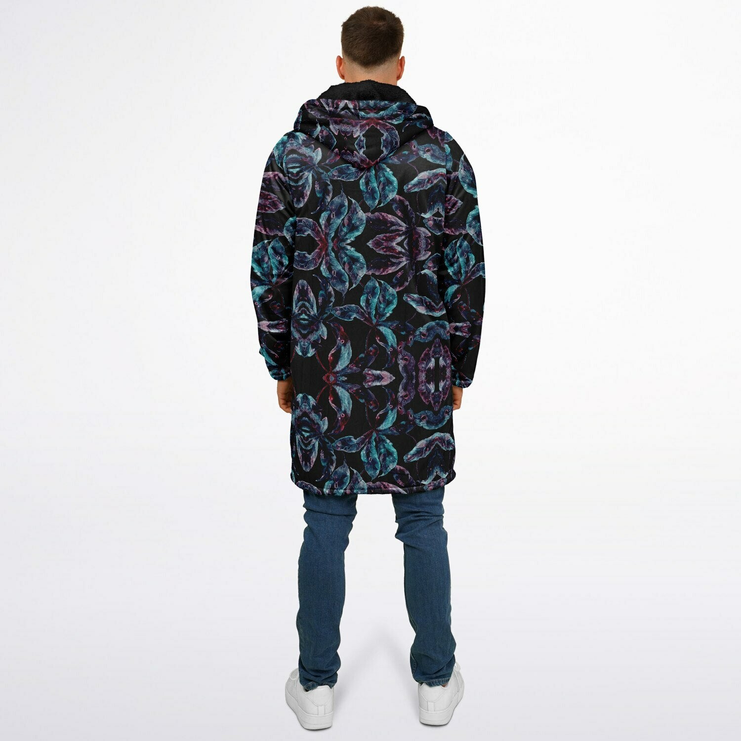 Dark Tropics Cuddle Coat | Unisex Minky Sherpa Lined Coat with Hood, Zipper and Pockets | Women and Mens Festival Coat | Mountain Fashion
