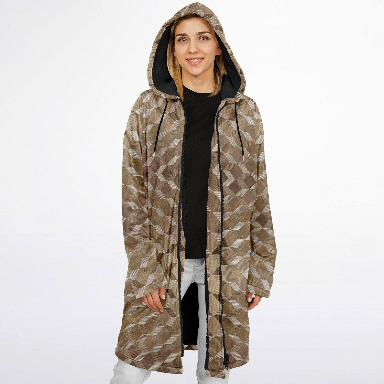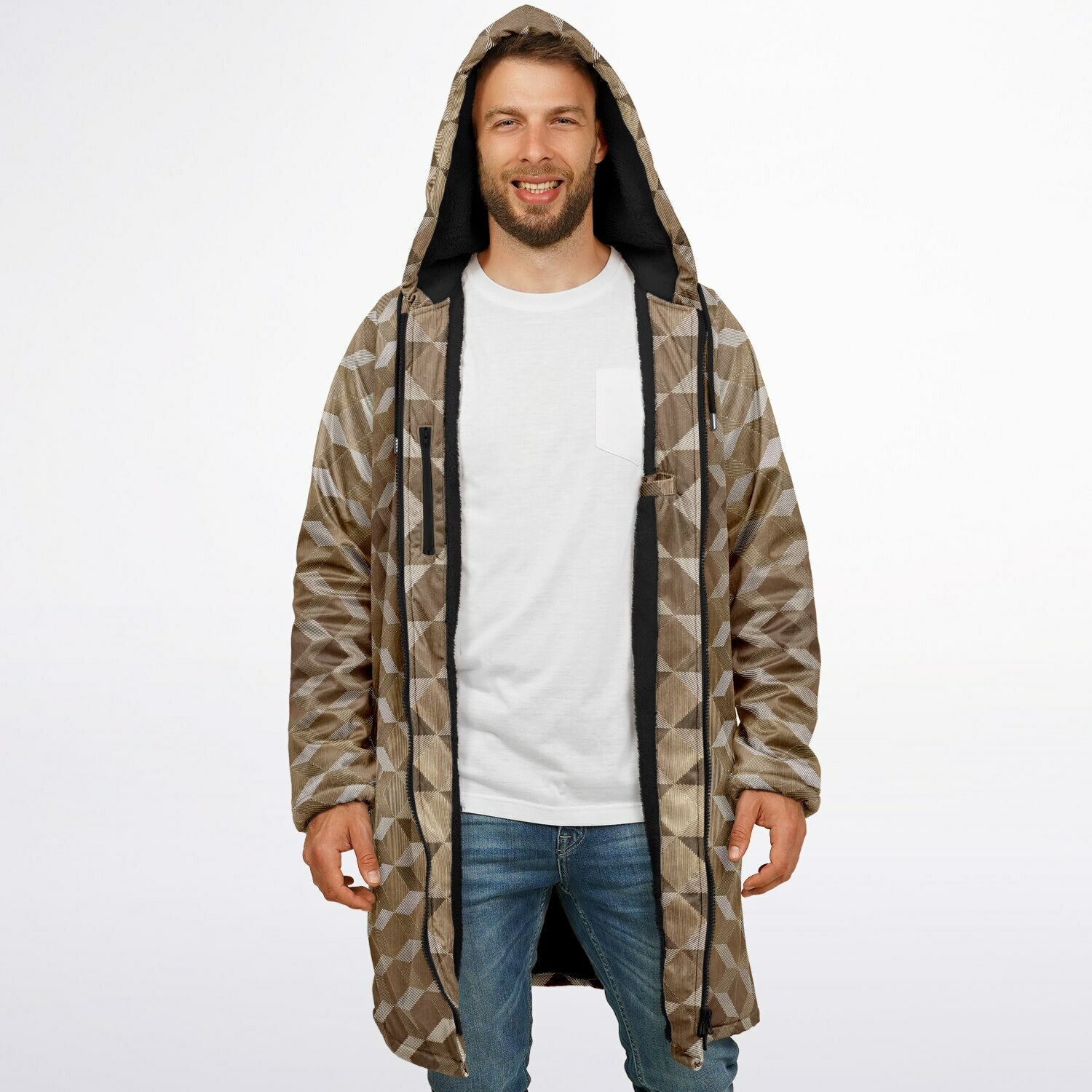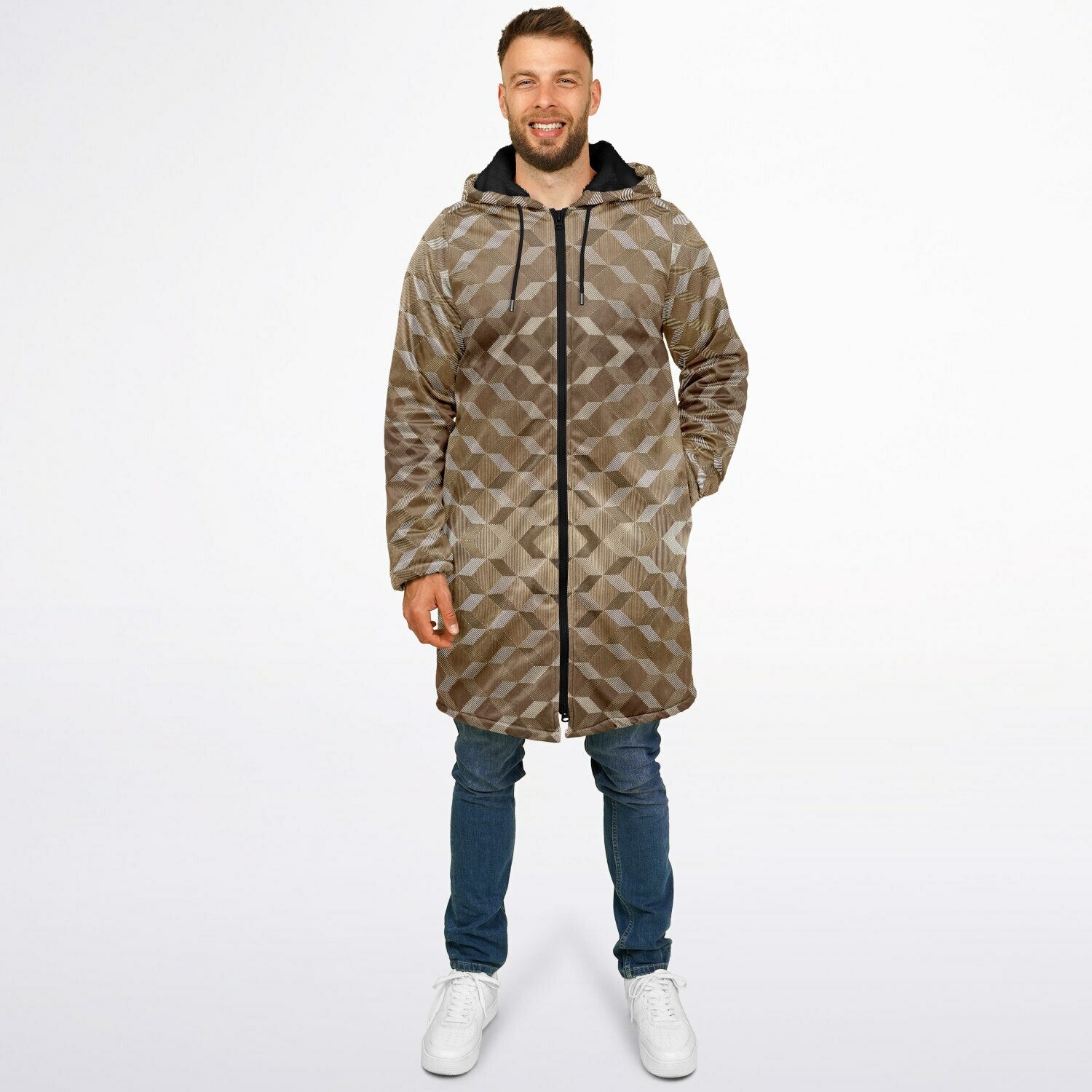 Gold Cube Cuddle Coat | Unisex Minky Sherpa Lined Coat with Hood, Zipper and Pockets | Women and Mens Festival Coat | Mountain Fashion
