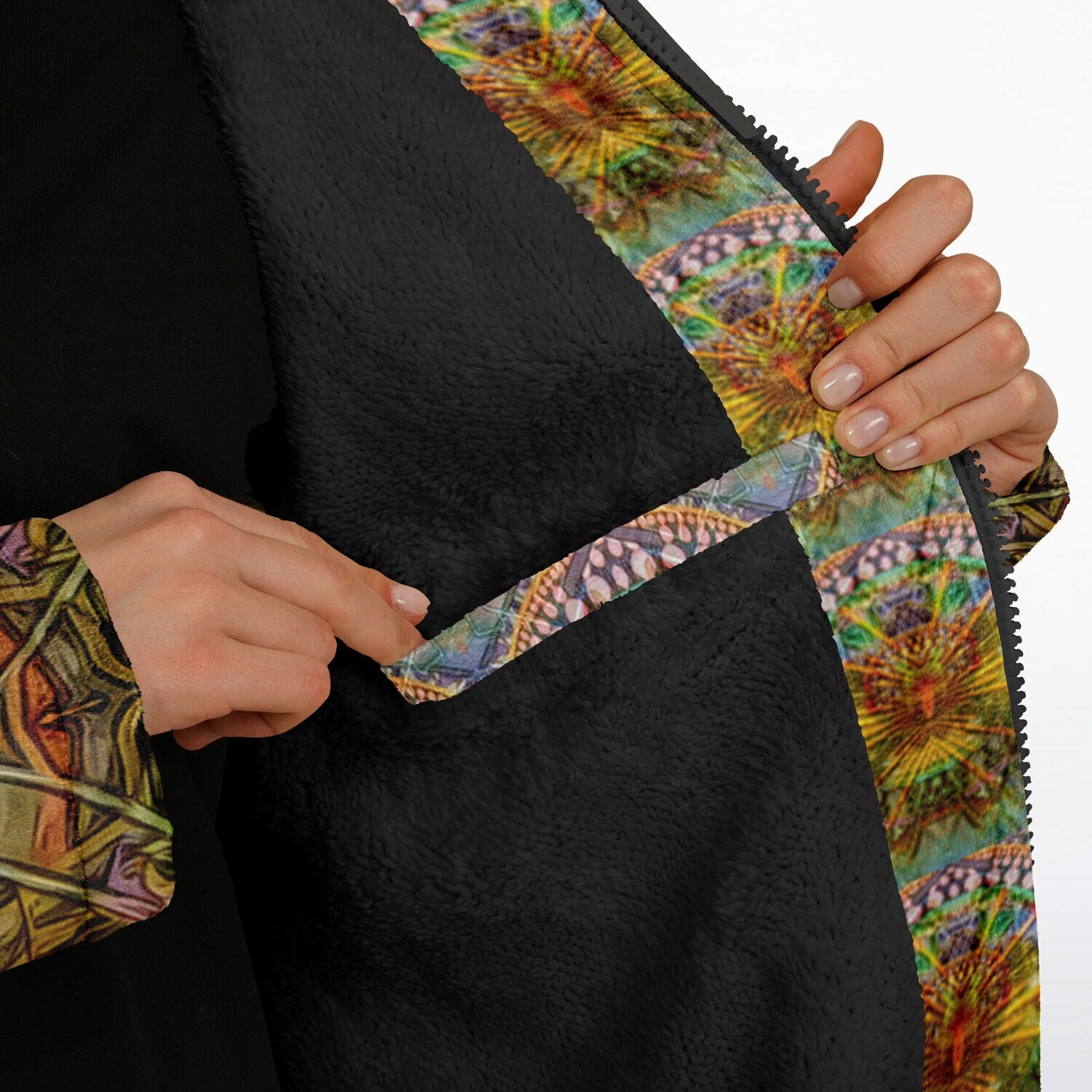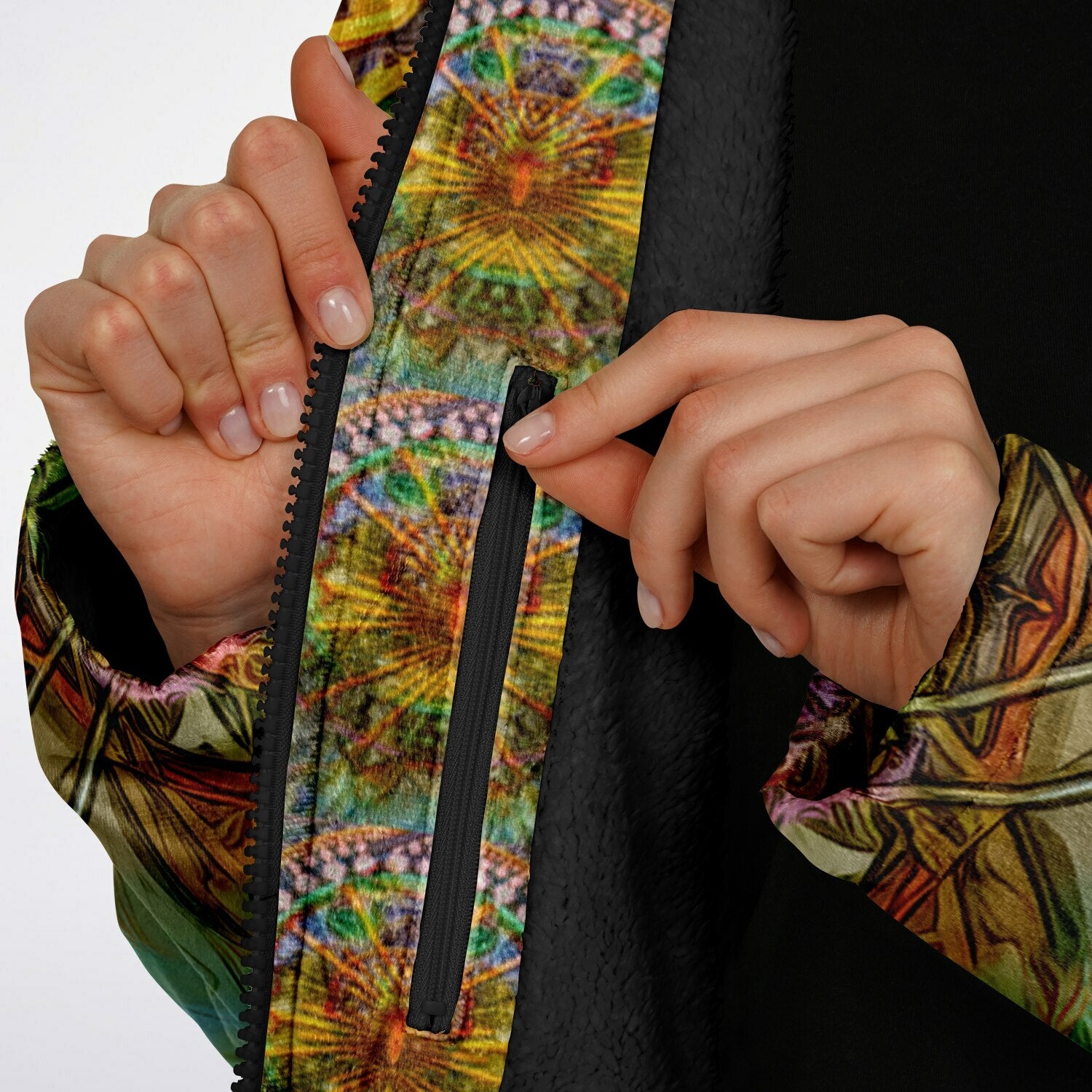 Lotus Guardian Cuddle Coat | Unisex Minky Sherpa Lined Coat with Hood, Zipper and Pockets | Women and Mens Festival Coat | Mountain Fashion