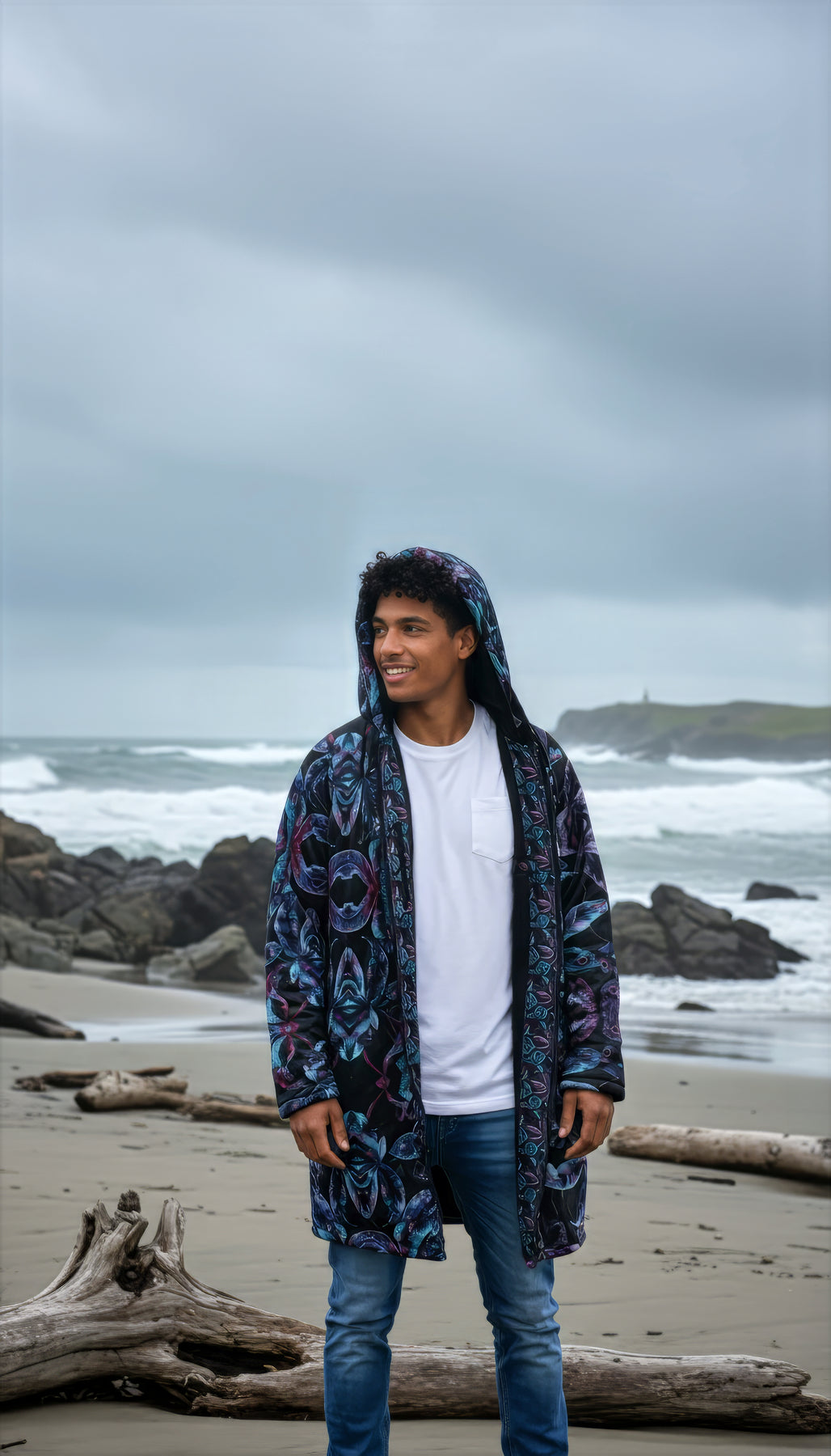 Dark Tropics Cuddle Coat | Unisex Minky Sherpa Lined Coat with Hood, Zipper and Pockets | Women and Mens Festival Coat | Mountain Fashion
