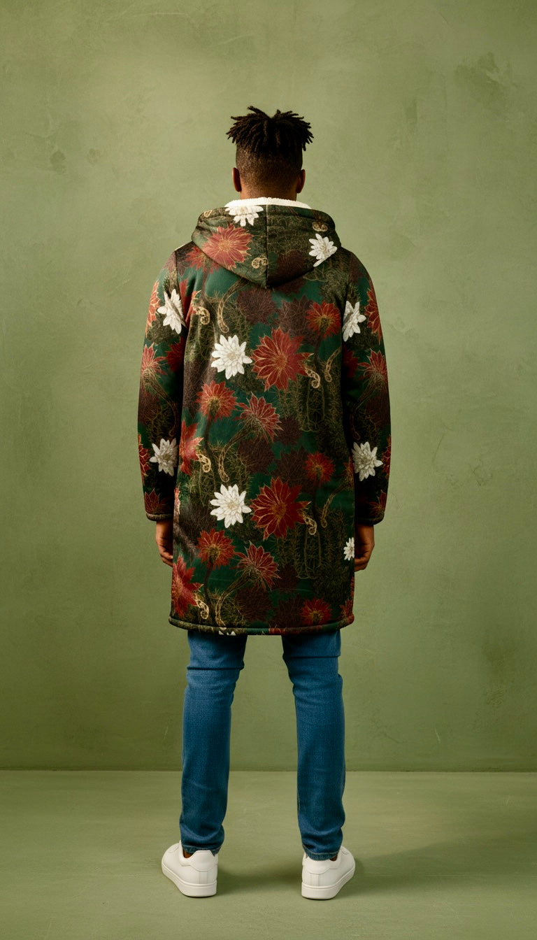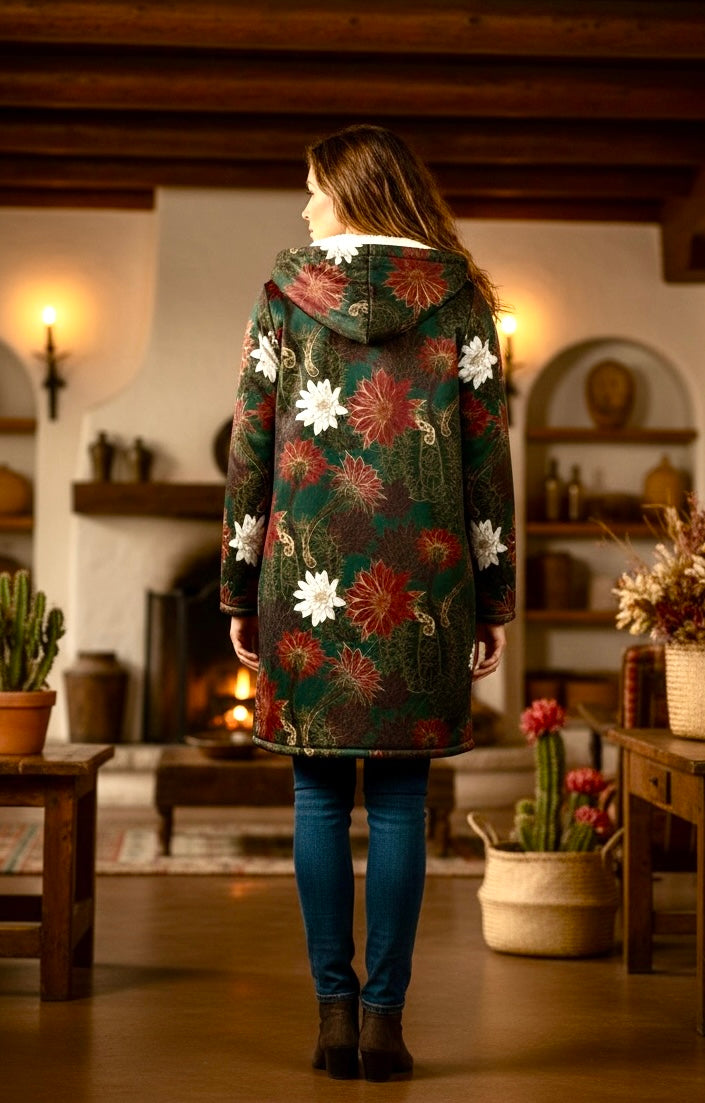 Desert Flowers Carpet Cuddle Coat | Green Red | Unisex Minky Sherpa Lined Coat with Hood, Zipper and Pockets | Women and Mens Festival Coat | Mountain Fashion