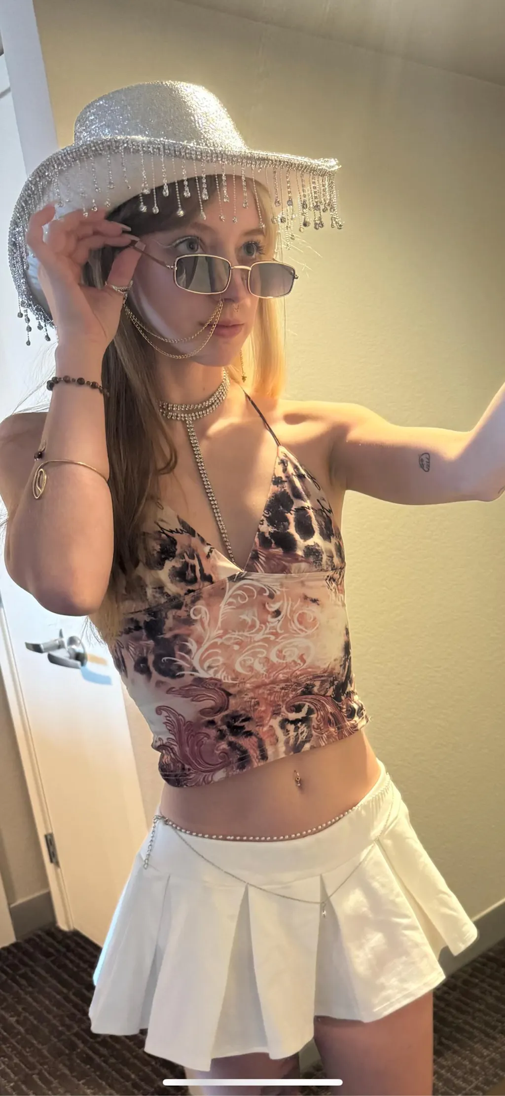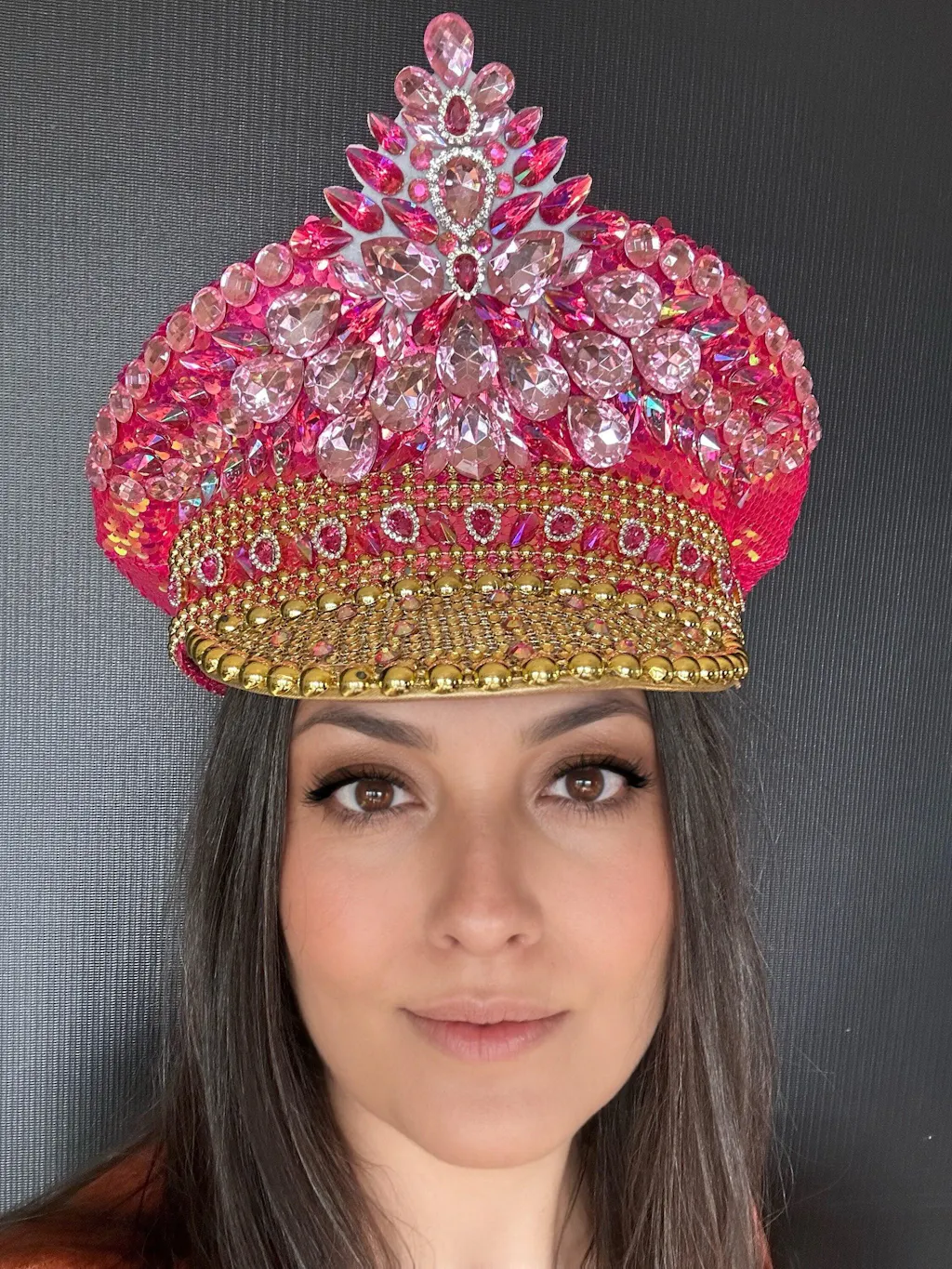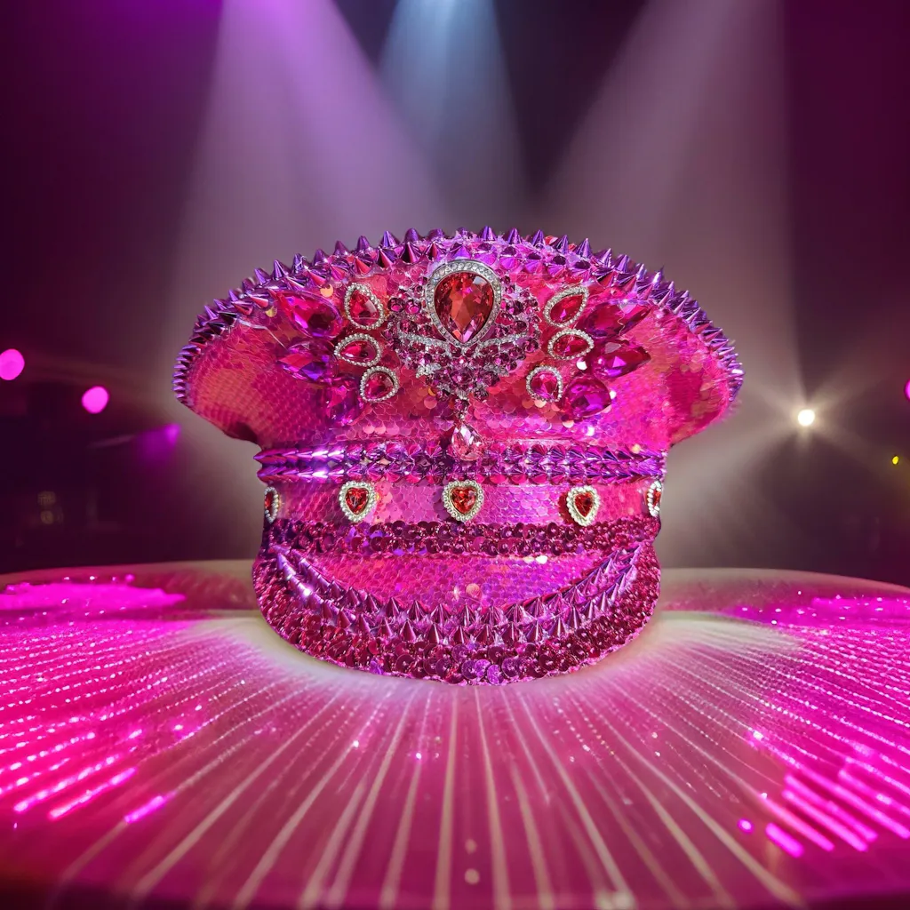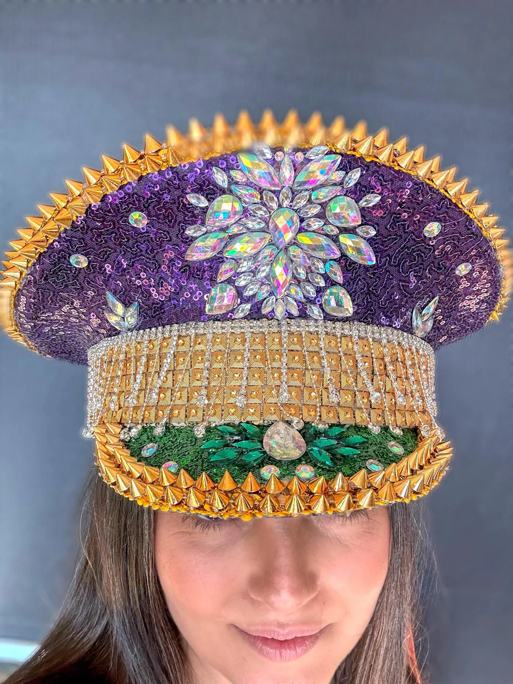 Introducing our Gold Captain Hat! This hat is adorned with stunning rhinestones and diamonds, creating a captivating sparkle that covers every inch of its surface. The majority of the hat is embellished with shimmering sequins, while the front boasts shiny rhinestones, adding an extra touch of glamour.