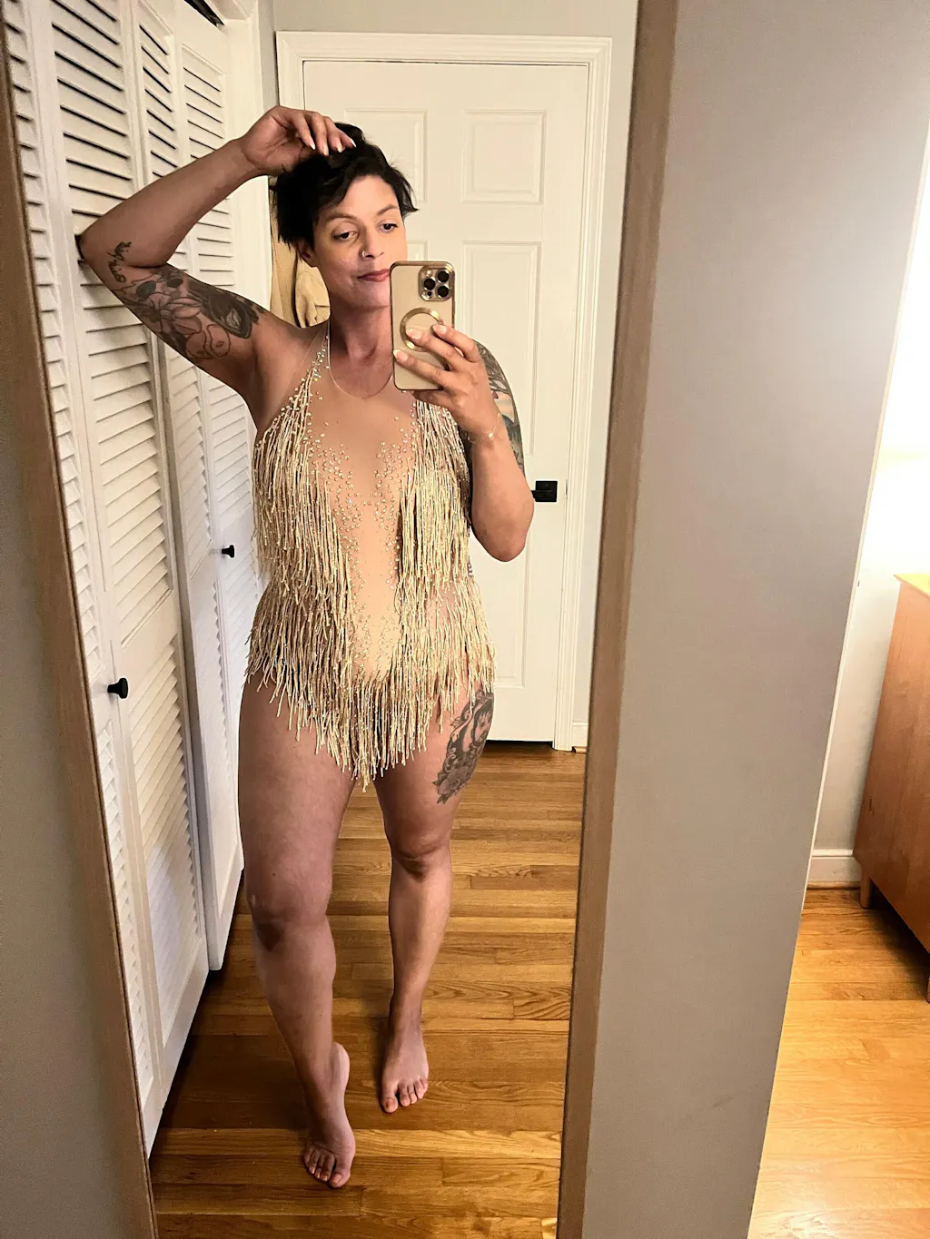 Gold tassel fringe rhinestone leotard — luxury performer outfit.