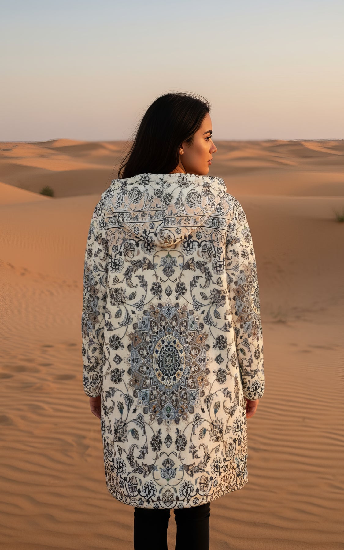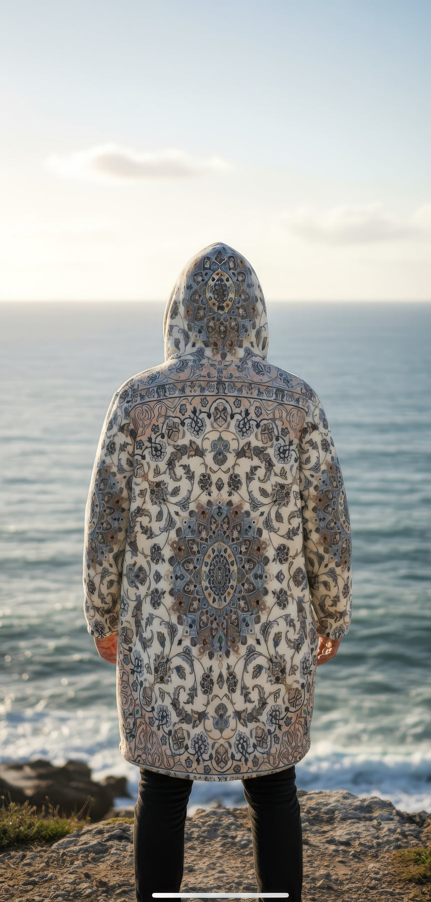Classic Persian Carpet Cuddle Coat | Nain, Cream and Soft Blue | Unisex Minky Sherpa Lined Coat with Hood, Zipper and Pockets | Women and Mens Festival Coat | Mountain Fashion