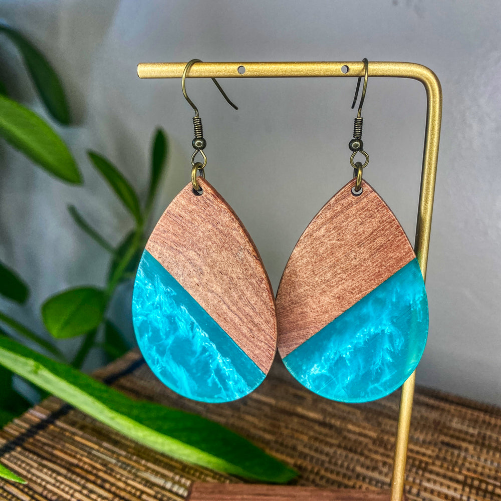 Tear Drop Natural Wood + Resin Earrings | Tahoe Blue | Large Dangle Earrings